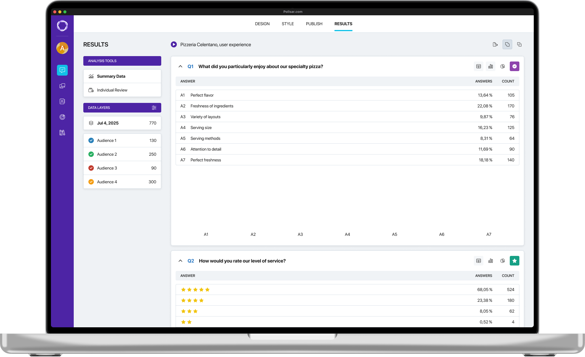 Your survey results are available as soon as respondents start answering, in the analytics section of the Pollsar platform. You’ll find summary statistics with audience filters, detailed data on each respondent, and export options for further work. Analytics updates in real-time, allowing you to track progress promptly. You can also make results public to share with a broader audience.